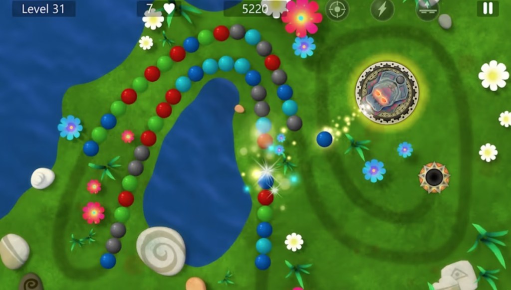 For those unfamiliar with the formula, you are firing multicolored balls or marbles from a central location at an ever-encroaching line of similar marbles pushing towards an exit hole. If the marbles reach the hole, you lose. To stop them, you shoot your marbles at the line to create matches of 3, destroying them.
