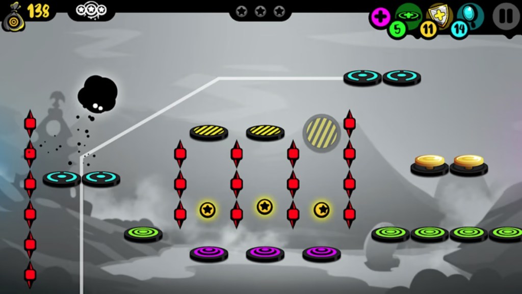 As for the gameplay, you’ll be trying to make your way through a series of levels that feel somewhat like obstacle courses. There’s not really a sense that you’re moving through places with their own personality so much as challenges created to give you a new task to accomplish. Still, at least as that goes, what’s here is pretty good – there’s a good variety of different elements to each stage, and the game does a good job mixing them up to keep things interesting. Likewise, the controls seem pretty good, albeit limited – you’ll only be moving left and right (as previously mentioned, you’ll constantly be bouncing, so no jump). The game also does provide you with consumable power-ups to expand your view, create a platform in a place of your choosing, or briefly give your blob invulnerability to stage hazards, which are a nice addition that players who are struggling may opt to reach for on occasion.