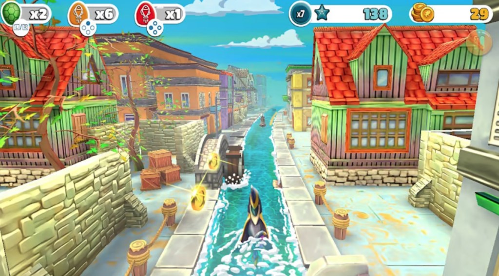 The sound also works very well here, with some catchy energetic music, nice noises for some of the objects that fly by you such as ducks quacking at you or steamboats chugging, and the pickup noise for nabbing coins is also quite nice.