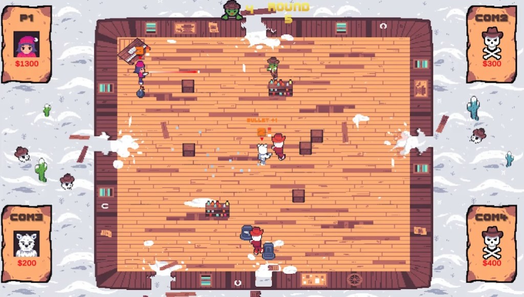 The presentation in Gun Skaters is a bit on the bland side, using repetitive pixel art visuals and a somewhat irritating soundtrack. The visuals really could have used a lot more variety, as players will only be fighting on a snowy field, a snowy soccer field, or a boxy area made of wooden boards. That’s it. What’s worse, obstacles like cacti are so pale that they blend into the background, making them harder to see.