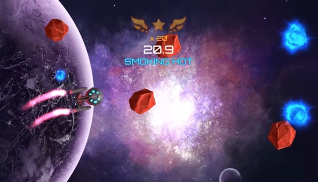 This is a really cool mechanic, and I wish it was used on a better game. Hyperide has a few problems that weigh it down. Firstly, the gameplay here is very repetitive. While the game does have a few different gameplay modes to shake things up, for the most part you’ll just be dodging the same rocks and picking up the same purple crystals and floating astronauts throughout.