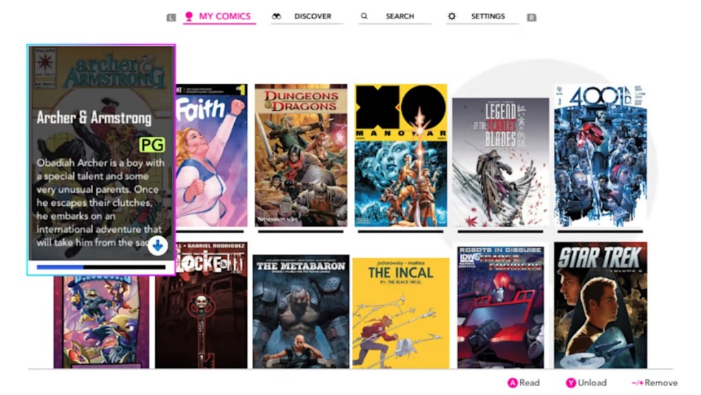 The app contains some good options too – you can download comics to view them offline later, there are multiple viewing modes, a decent zoom feature, and good touchscreen support. I will note that there is a minor frustration here in that the “page forward” and “page backward” buttons seem flipped from what would make sense (ZL is page forward and ZR is page backwards), but you get used to it quickly enough.