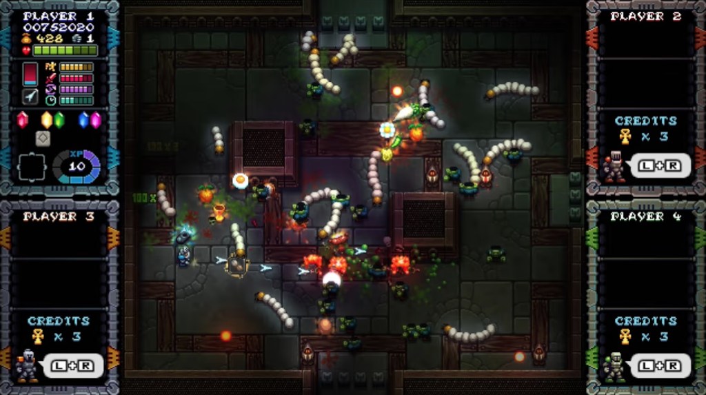 tl;dr – Iron Crypticle is an Arcade-style 2-Stick Shooter that plays like Smash TV with a Ghosts ‘N Goblins aesthetic. It’s a game with good, arcadey action that works well in co-op, though it’s not without its issues here and there.