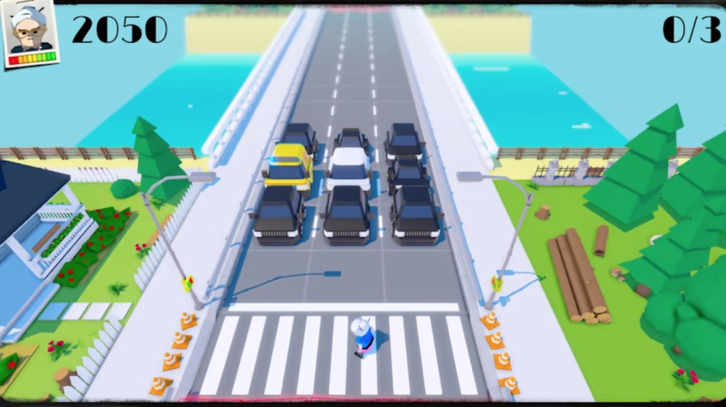CrossKrush is an Arcade-style game with Puzzle elements released in 2020 on PC, PlayStation 4, Xbox One, and Nintendo Switch. In this game, players take the role of the husband or wife in an elderly couple whose quiet, peaceful life in retirement is ruined when a loud highway is built in front of their house, leading them to take revenge by detonating explosives to destroy every last car that uses the highway (save for emergency vehicles).