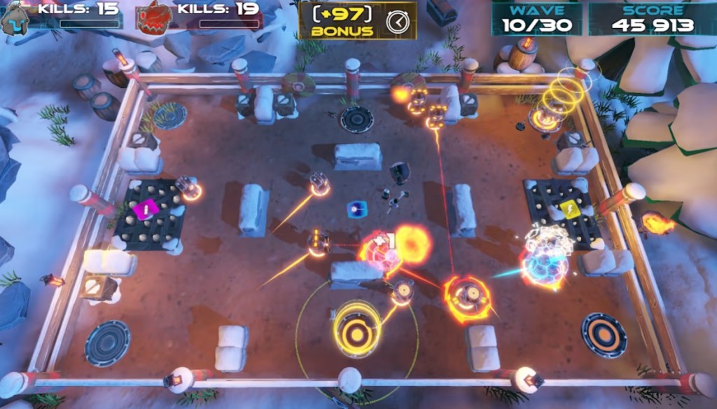 Speaking of simple, players only get a few different game modes. For one player or two-player co-op, there’s a “horde” mode that just spawns waves of single-task robots that need to be defeated without dying. For two to four players, there’s deathmatch and last man standing modes… and that’s it. Also, I should note that when I say “two to four players” – the game does not allow you to play the deathmatch with bots, so this mode is unplayable without other players sitting next to you.