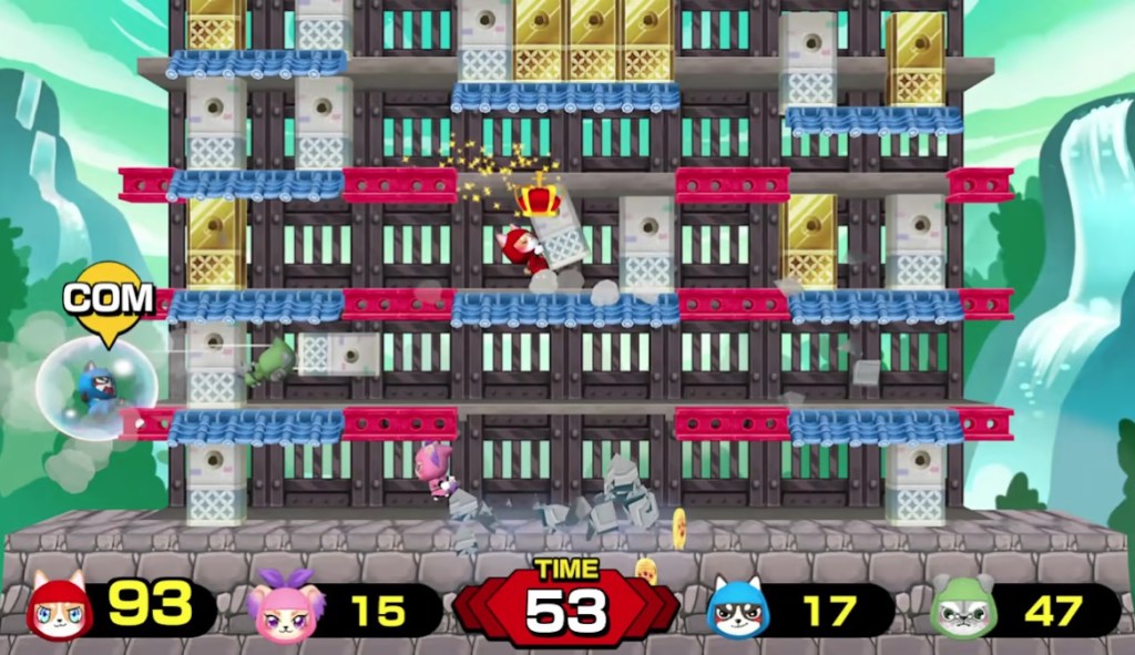 Doggie Ninja is an Arcade-style game that’s reminiscent of the Wrecking Crew level from the last few Super Smash Bros. games. Players play as one of the titular doggie ninjas as they grab and toss gold blocks to demolish them and collect coins, and must evade the falling floors once they’re no longer being supported from below. The player with the most coins by the time the level’s timer is up wins.