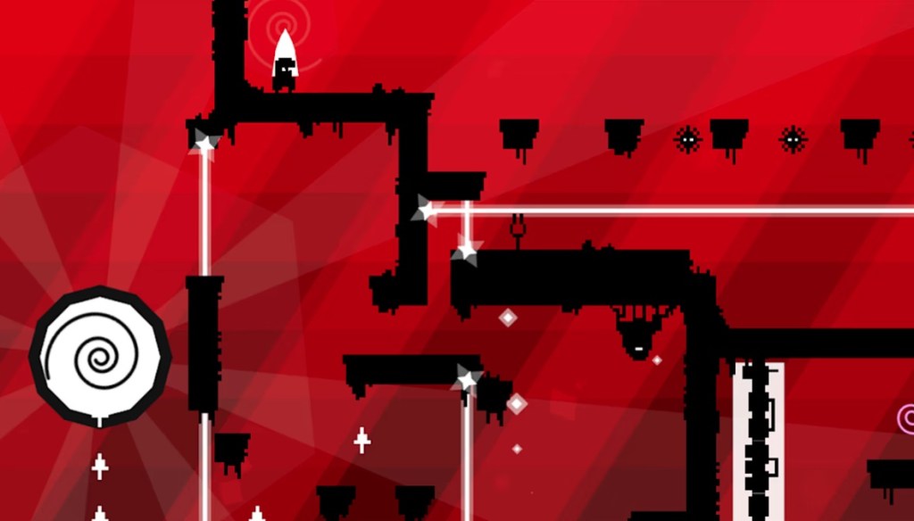 The presentation here is good, but odd. This game combines very simple 2D pixel art visuals with a limited color palette and minimal detail, backed by catchy but unmemorable techno-style music. This in itself would be pretty good, but the game adds to this a very awkward, orgasmic “ohhhh yeahhhh” whenever you pass or respawn at a checkpoint, which will be often since you will die a lot in this game. The game cycles through multiple “ohhhh yeahhhh”s from multiple voice actors, male and female, so soon enough anyone listening to you play this game may well get the impression that you’re watching or playing something… well, inappropriate in a family-friendly setting.
