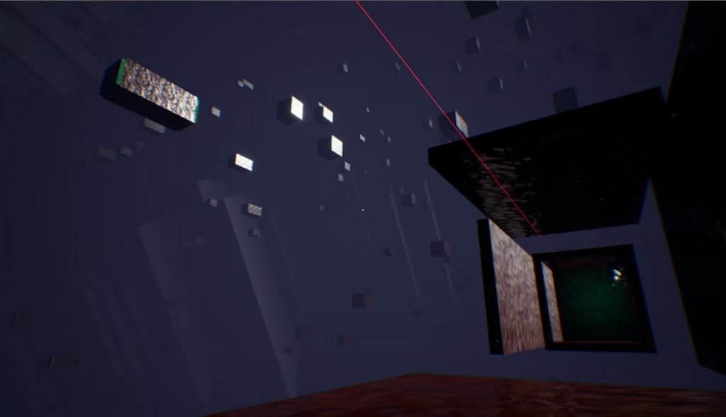 EQI, released on PC and Nintendo Switch in 2021, is a First-Person Platformer with elements of Puzzle-Platform games. Players must navigate to an exit in each level, usually by manipulating the level itself, which rotates at 90-degree angles around a green laser beam.