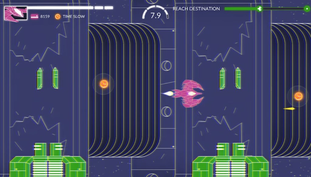 Escape From the Universe is a Shmup with a unique presentation where objects are depicted in flat colors (pink and green) with white borders, and with gameplay that has an interesting twist on the genre – the farther you move your ship to the right on the screen, the faster it scrolls.