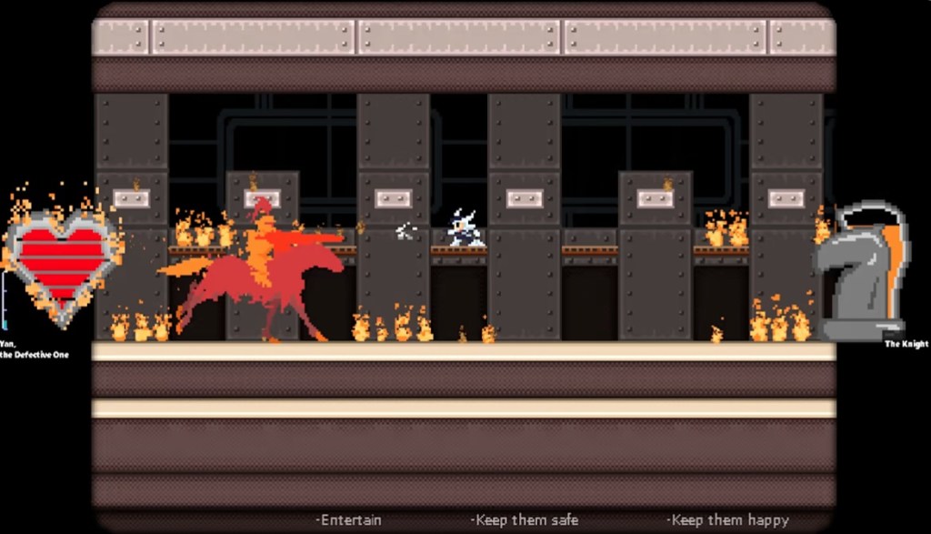 Firework is an Action-Platformer released on PC in 2018 and ported to Nintendo Switch in 2020. Players take the role of someone named Yan who is the caretaker of a facility looking after some childlike… um… dots… when the facility is attacked by a group of… um… enemies… all of whom have fire-themed powers.