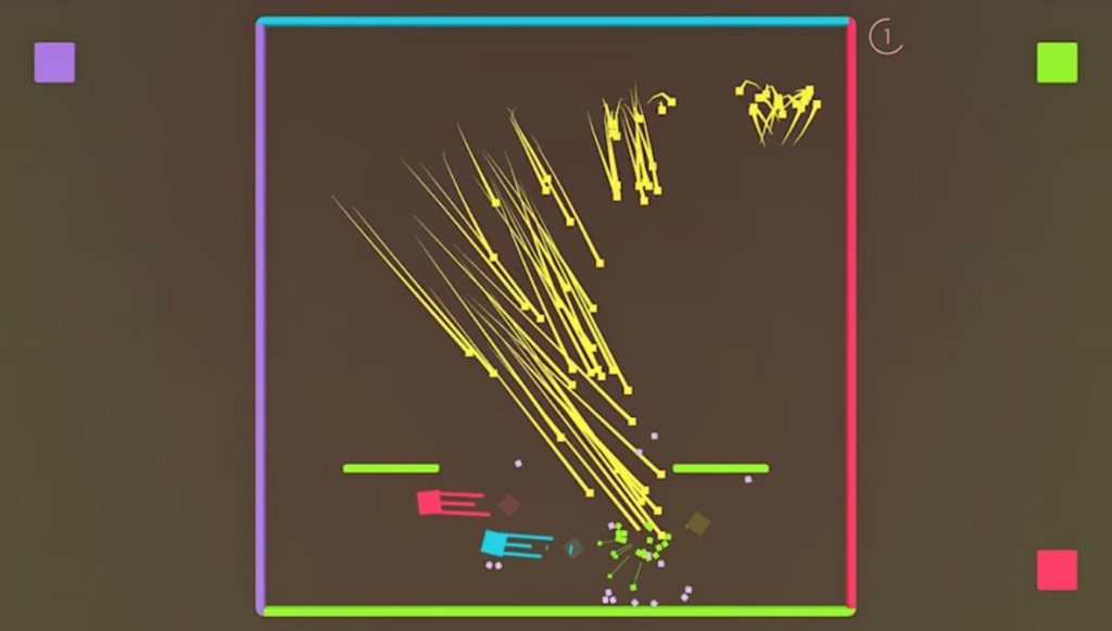 The presentation here is pretty simple – flat-colored geometric shapes on a flat-colored background. Pretty plain looking, which keeps the focus largely on the action. The high-energy music, likewise, isn’t especially memorable, but it suits the intensity of the game and isn’t annoying. There are a few elements of the presentation I found annoying though – the game sometimes uses glowing red-colored walls to denote that a wall or floor is lethal, which is fine, except some touchable walls are similarly-colored, which can be confusing. Likewise, it would have been nice if players were given an indication which enemies can be detonated by your attack and which can’t, instead of just leaving it to the player to figure it out through trial and error.