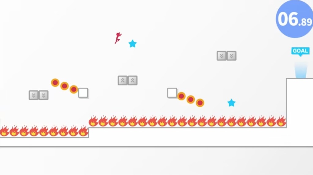 Much like the visuals, the gameplay here is extremely simple. You can jump, wall jump, and hold down a button to run, and that’s about it. The stages themselves have a decent variety of obstacles but there’s nothing too creative going on here. It’s just a simple, but difficult, Platformer.