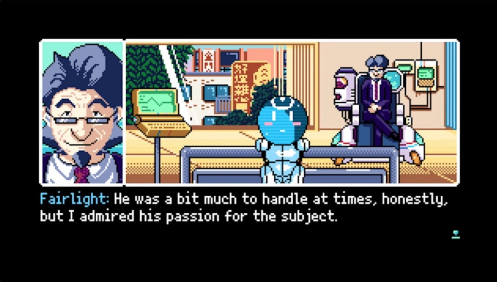 The presentation here has a very nostalgic feel to it, with decent pixel art graphics and an art style that actually reminded me a bit of the Phoenix Wright games. Where some cyperpunk setting games make things a bit grungy and have everything either neon-soaked or poorly-lit, the presentation here is bright, colorful, and cheerful, even if the story can get a bit dark and violent in places. This, paired with a decent chiptune soundtrack, makes for a nice overall aesthetic.