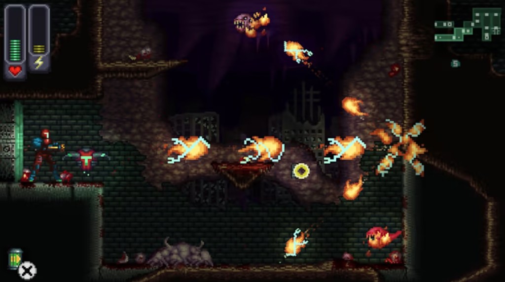 On the surface, the game looks very much like a carbon copy of Metroid, with very similar gameplay, similar level design and map design, even down to the way that upgrades are displayed on the map and your character does a spinning flip if you jump while moving in a direction. However, you’ll notice one thing missing from a typical Metroidvania: the ability to save.