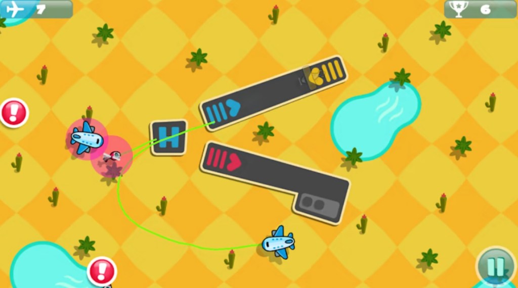 As for the gameplay, this is a decent but fairly standard game in this style. Players guide three kinds of planes to like-colored landing strips, as well as directing helicopters to helipads. At any time you can change the route to adjust for new planes entering the scene. This is all pretty standard stuff.