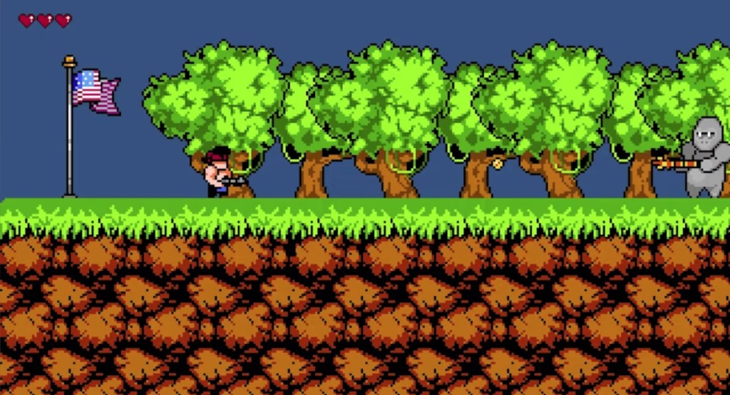 American Man is an Action-Platformer released on Nintendo Switch in 2021. This game seems to be an imitation of the sort of Platformer we saw in the early games in the Contra series, complete with a Rambo-esque shirtless protagonist toting a machine gun, with players using that gun to shoot down hordes of animals that have been brainwashed to become enemy soldiers.