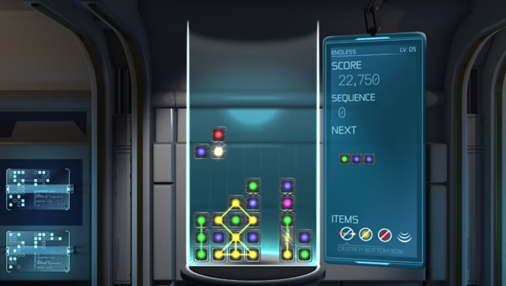 Anode is a falling block Puzzle game where players create a connected chain of like-colored blocks, and then detonate it using a like-colored “detonator” piece to clear them. Occasionally you’ll also come across “coupler” pieces that allow you to connect one color chain to another.