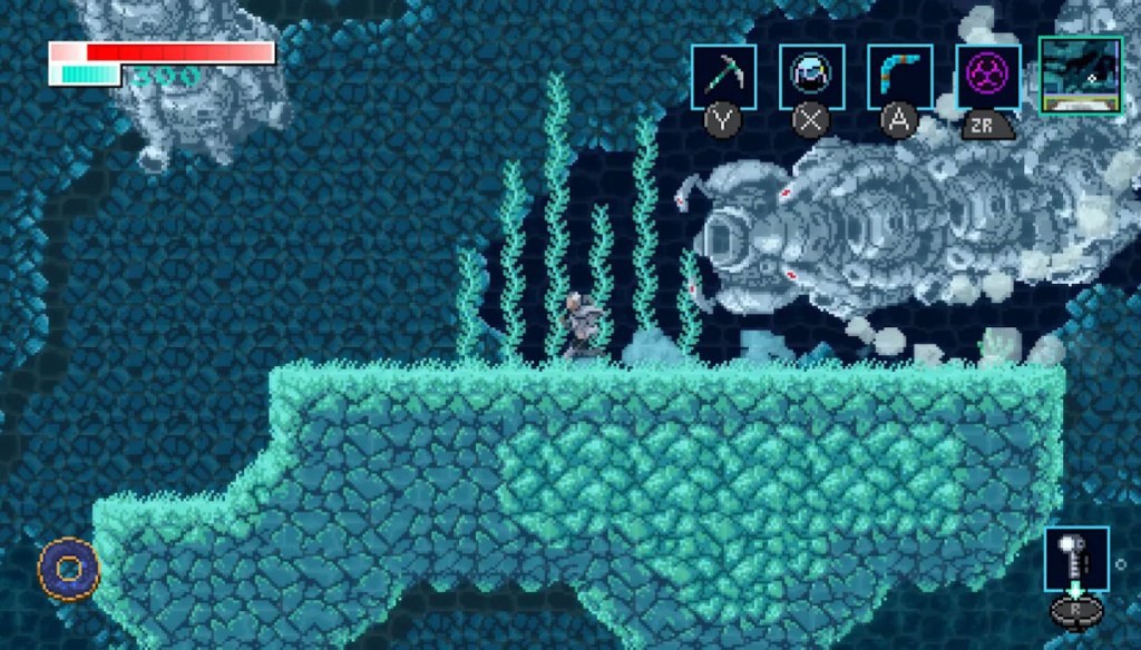 This limitation doesn’t necessarily mean that this game is difficult – enemies in Axiom Verge 2 do not damage you on contact, meaning that players needn’t worry about avoiding those enemies as much as you need to evade their attacks. This makes for some interesting moments where players can run right through a horde of enemies without taking damage, or even making running right up to a massive boss and wailing on him at point-blank range a perfectly viable strategy.