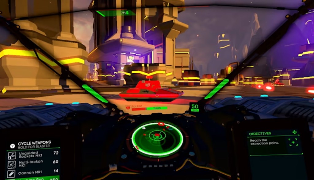I do have a bunch of more minor complaints, however. Firstly, the game shows its VR roots in having your simulated “head” move when aiming, and doing so obscures HUD information in your cockpit, such as the enemy radar and weapon info. Also, some of the limitations the game places on you are frustrating – not being able to drive over any moderate-sized bump in the road, swapping weapons taking a little while to load, reloading weapons happening often and also taking a while… this game is full of a lot of little annoyances like this, and while it doesn’t outweigh the good gameplay here, it does dampen it somewhat. Finally, while the game does support co-op play, be aware that you’ll need to bring your own friend, as the online servers are currently empty.