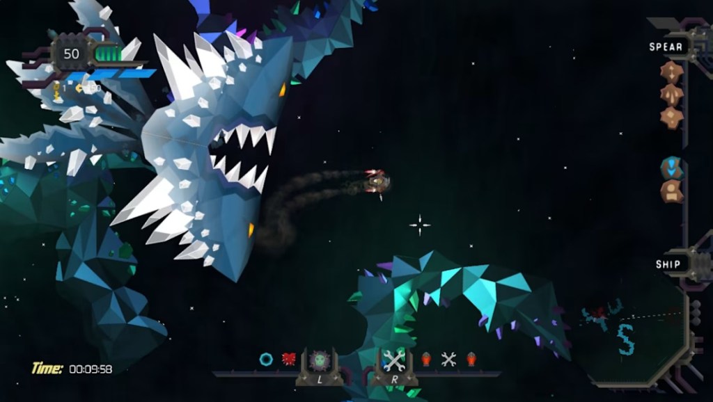 Gameplay in Blacksea Odyssey primarily consists of tracking down space critters and using two-stick shooter mechanics to take them out. You’ll have two primary weapons at your disposal, a spear, which is frustratingly low in power and slow to toss, and a harpoon, which is even slower, and keeps you from using the spear while charging it. You can use the harpoon to rip off body parts of the aliens, but this doesn’t really seem to hobble their abilities much – it just takes off some health.