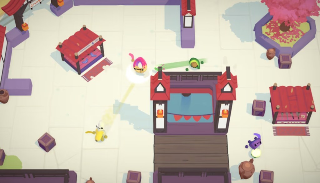 Boomerang Fu is a family-friendly Top-Down Arcade / Party Game that has players fighting one another as various anthropomorphized food items, each armed with a boomerang. This game was released on multiple platforms in 2020, including the Nintendo Switch.