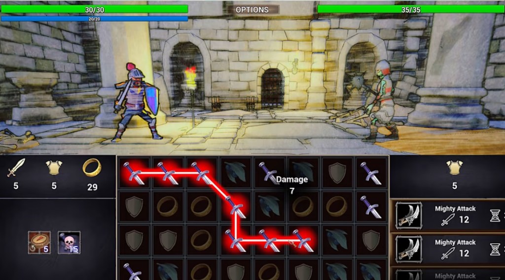 Right off the bat, this seems to set up gameplay that’s similar to a cross between Puzzle Quest and Grindstone, and that’s a promising combination – both of those are phenomenal Puzzle games. Unfortunately, it fails to properly build on any of this. There is no enemy AI at all whatsoever – enemies will wait for two turns, and on the third turn deal a set amount of damage, always, without any deviation. Players can upgrade their shield, armor, and weapon, but different equipment doesn’t do anything in particular, it just buffs one of your stats.