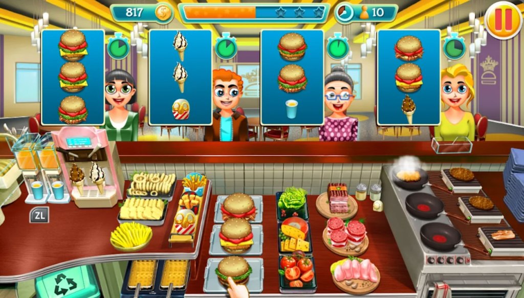 For this game, what customers will order is fairly straightforward – you have a growing assortment of meats that can be placed on the grill, and a growing assortment of side-dishes to put in the deep frier, along with drinks and, later, ice cream to prepare. This is more complex than Pizza Bar Tycoon, but still fairly simple overall.