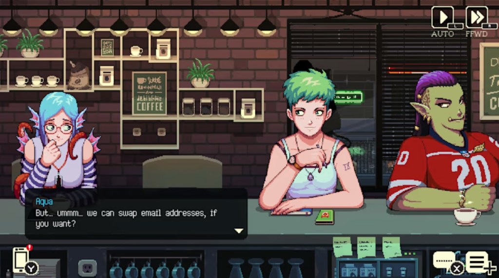 I feel I should make special note of the great use of sound this game has, from the way the sounds of your coffee preparations change based on the ingredients you use, to even the differences in the patrons’ footsteps as they approach – I could easily tell, for example, when Aqua the Atlantean was about to step up to the counter whenever I heard the telltale wet squish of her footsteps. And while there’s no spoken dialogue in the game, characters definitely all have their own unique voice thanks to the different sound effects that accompany their text.