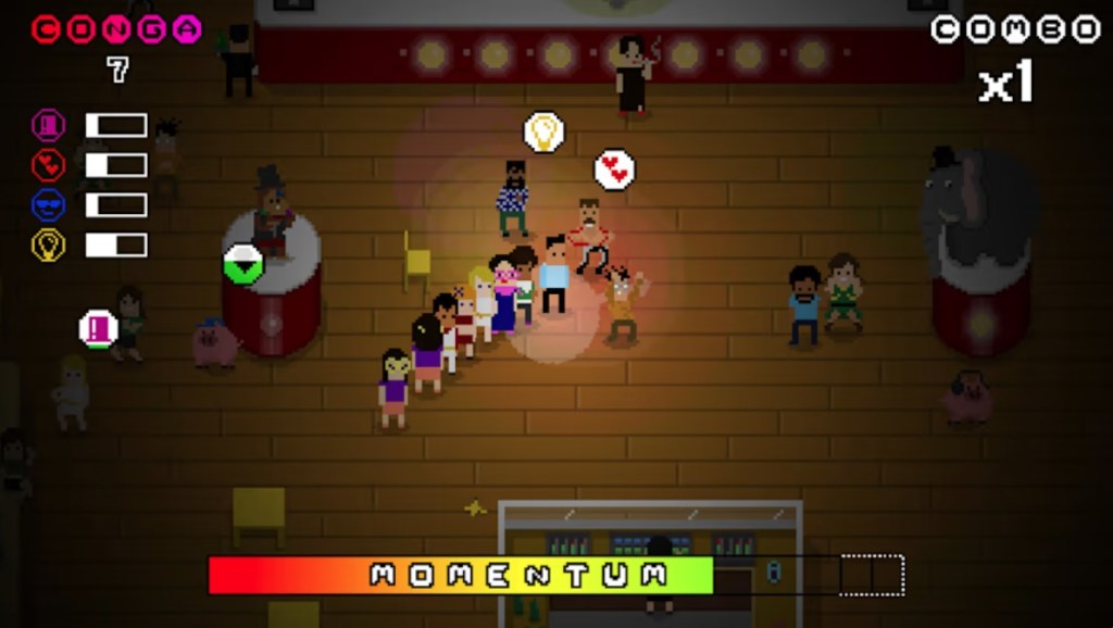 Anyway, as you move around, you attract the attention of partygoers standing close enough to take notice of you. Stick around them long enough to keep their interest and they’ll join your line. As you move around, there’s a “momentum” meter constantly ticking down and refueling whenever you add someone to your line, with a bigger bonus when you nab multiple people in quick succession.
