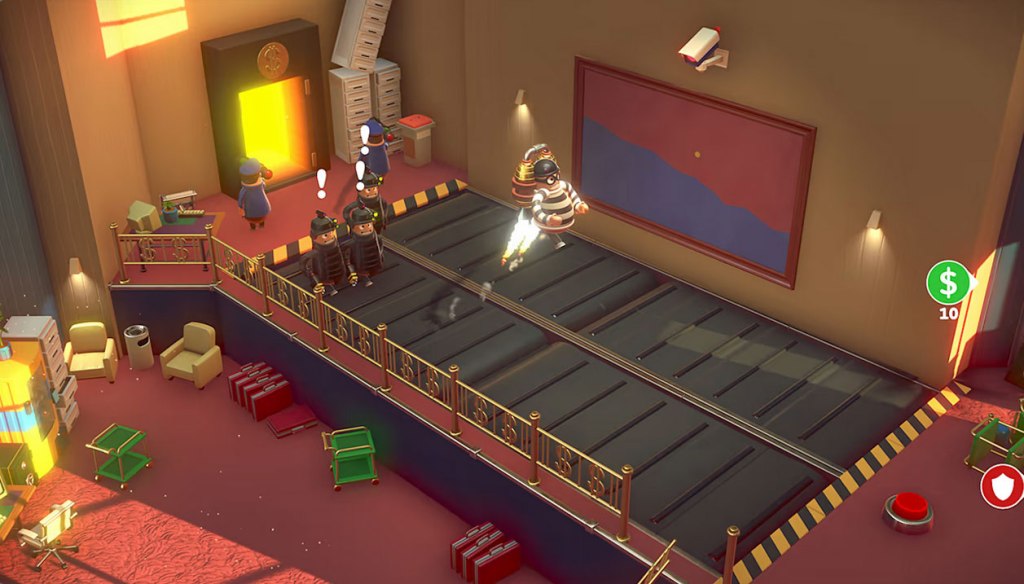 Of course, it might not be brawling with each other. This game includes multiple game modes – some are a standard deathmatch or “last man standing”, but some have players competing to eliminate the most computer-controlled “cops”, some have them trying to be the one to exit the level with the most stolen cash, and others have them playing “bomb tag”. There’s even a fill “arcade” mode that has players trying to steal loot and escape the cops in various levels, with full co-op play. The variety of game modes and levels to play on (with some really good level design) is one of Rubber Bandits’ greatest strengths, ensuring that this game has a lot of variety.