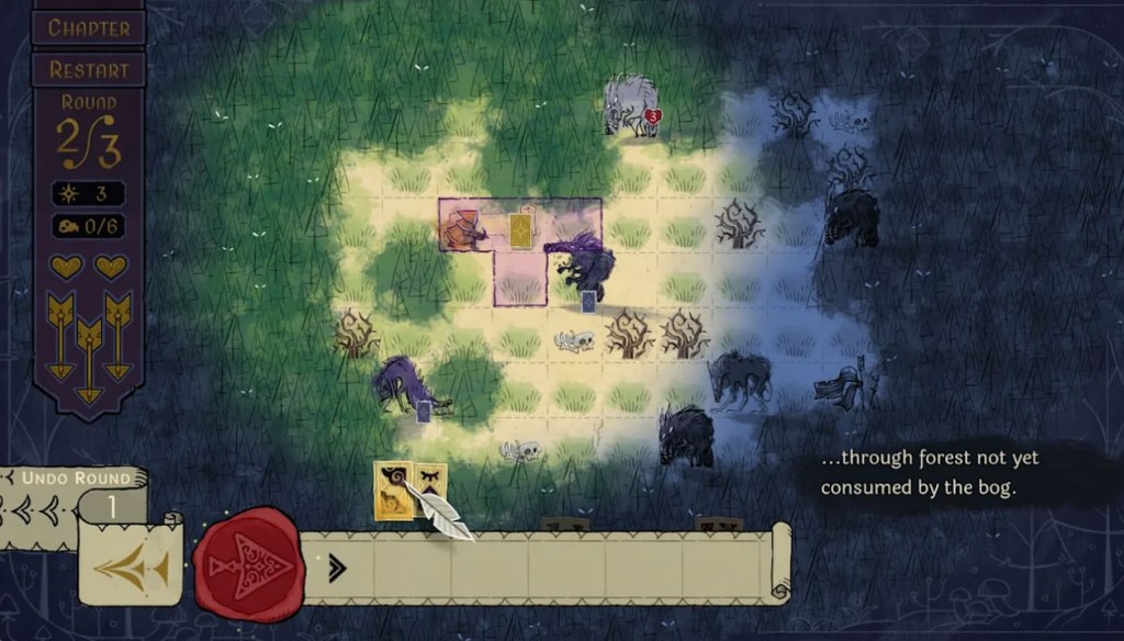 The gameplay here starts out simple enough, almost like chess. Players begin with only a few action points, each of which can be used to move, or to perform one of multiple abilities. The player is vulnerable to the beasts, but has a limited number of arrows with which to kill them in each level, as well as other abilities like being able to shove nearby beasts into walls, obstacles, or other beasts. When in range, beasts will react to your movements in a predictable manner, and using this knowledge, players must carefully plan their route to reach each level’s exit without getting slaughtered.
