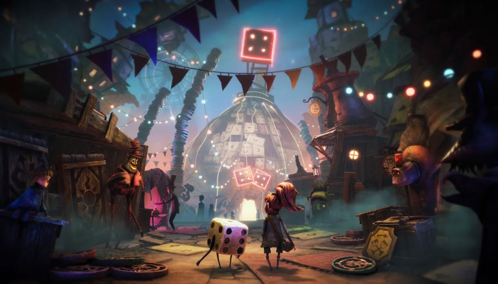 Lost in Random is an Action-RPG with Card RPG elements released in 2021 on PC, PlayStation 4, Xbox One, and Nintendo Switch. This game is set in a dark fantasy world in a kingdom divided into six numbered districts, each corresponding to a side of a standard dice, with the denizens sorted into these realms via an enchanted (and rigged) dice roll by the realm’s dictatorial queen. In this game, players take the role of a young girl named Even who chases after her sister, Odd, when one such dice roll forces her to leave her family to be taken to the queen’s district.