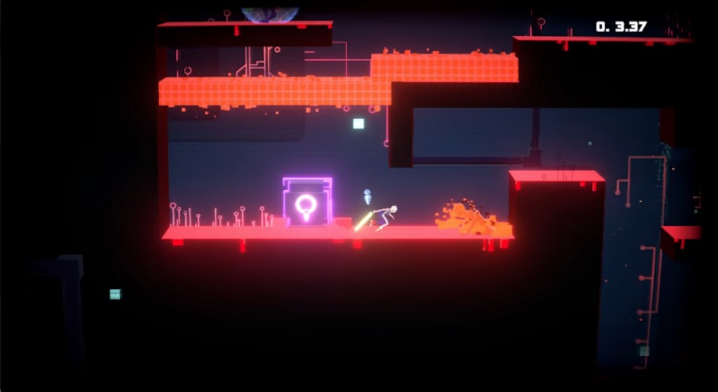 The presentation here is kinda’ a problem. The game’s glowy neon, vaguely Tron-like visuals are pretty low-res, and everything in the game seems to be overlaid with a “glitchy” filter that makes it all look like stuff is occasionally freezing or shuddering. While this is certainly intentional, it seems like it is here in part to hide that the game itself suffers from nasty framerate issues that cause the game to shutter and move unpredictably, something that is not conducive to the sort of fast-paced high-skill Action-Platformer that this game is aiming to be. These visuals are backed by a repetitive techno-style soundtrack that works for the game’s theming, but isn’t memorable or interesting.