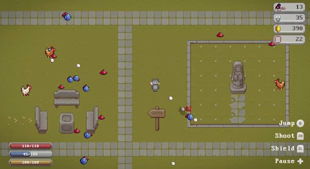 The presentation doesn’t help this game stand out either. The 2D pixel art visuals work well enough for the gameplay here, but neither your anthropomorphic cat character nor the hordes of enemies, nor the areas you fight them in are particularly distinct in any way. And while the energetic synthesized music is pretty decent here, it’s not enough to save this otherwise pointless game.
