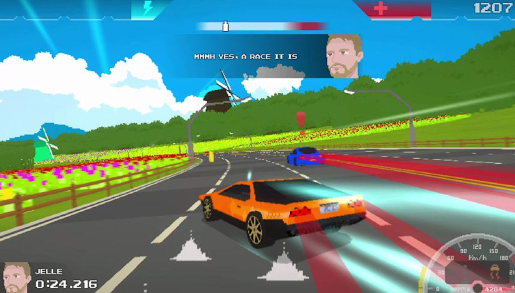 All of this game’s courses are procedurally-generated, which potentially means that you have an endless amount of levels to play, but it also means that you’ll never be memorizing any of those levels to improve your times. The game also has cop cars that will attempt to bash into you if they catch you driving on the wrong side of the road.