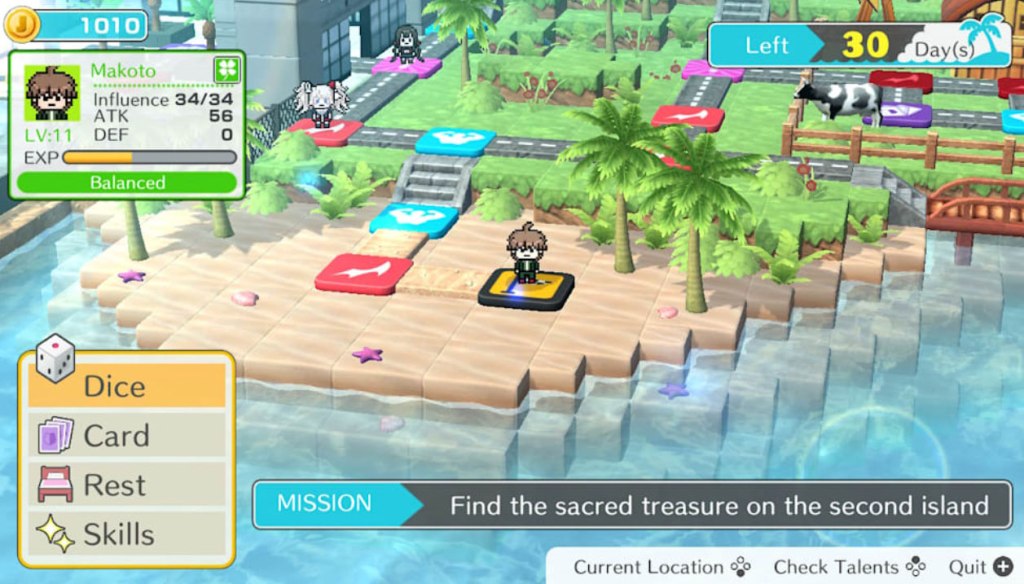 Let’s start by looking at the Development mode. Unfortunately, despite being clearly inspired by games like Mario Party, there’s no multiplayer support here, and no minigames. You’re just rolling dice and using cards to move to spaces around the island, hoping to take advantage of those spaces to improve your character’s stats. There are goals to achieve, but it’s unclear how you’re meant to achieve them. And there are bosses to fight, but it’s unclear exactly how to find where all of them are, and you’re not given a clear indication when you’ve leveled up your character enough to be able to fight them.