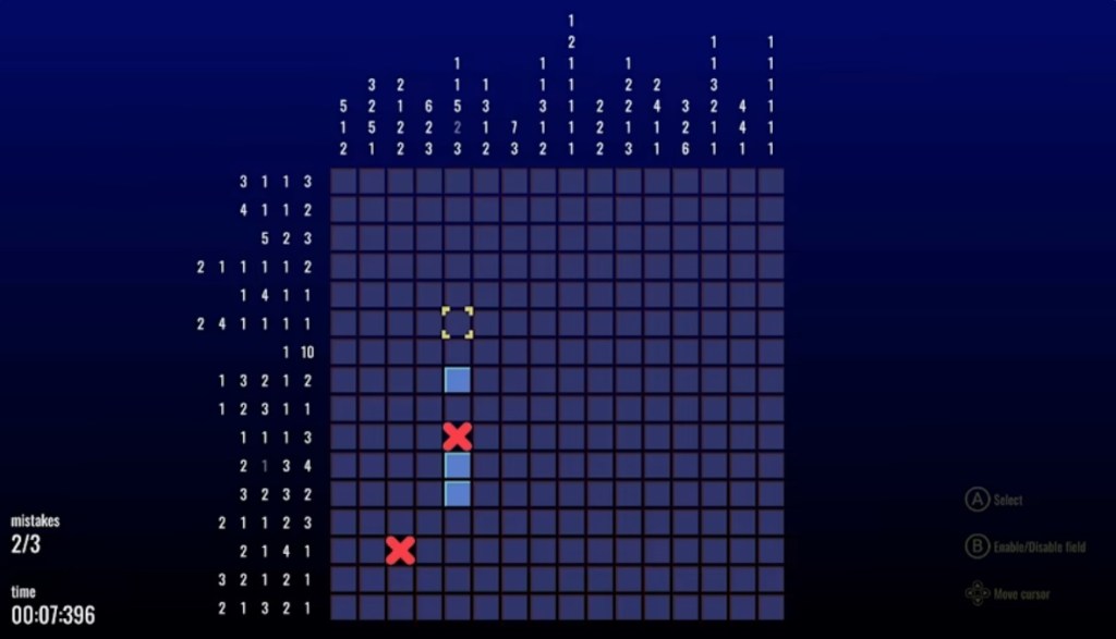 Unfortunately, that is to say, there are some pretty major problems here. Let’s start with the smallest and work our way up. This game has no touchscreen support, everything must be done using traditional gamepad controls. This would be fine, except that the controls are clunky, with the game not letting you hold down a button to mark multiple cels – you need to tap the button for each cel you want to mark, which can get quite tedious. It gets worse – unlike most decent Picross games, there is no way to test-mark a cel to work through a theory or check something before marking it. You can only mark it as filled or empty, and the game automatically penalizes you if you’re wrong.