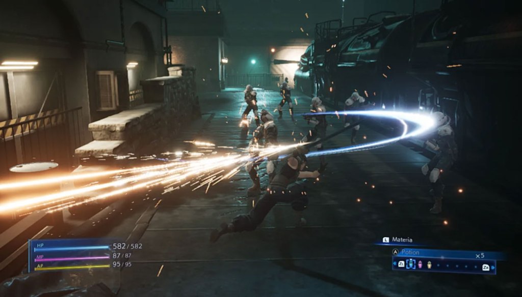 At least when it comes to visuals, Crisis Core Reunion looks pretty good on Nintendo Switch, with detailed characters and environments (many of those environments pulled directly from Final Fantasy VII Remake), some nice lighting and reflection effects, and some excellent visual flair in its magic spells and attacks. However, compared to the version of the game we received on other platforms, the Nintendo Switch version has less-detailed shadows, really nasty aliasing, and features a lower resolution, with a dynamic 720P in both docked and portable modes and a drop from 60FPS on other platforms to 30FPS here (thanks to Digital Foundry for the numbers!). Overall, it’s a pretty decent compromise to get this game running on Nintendo Switch, though out of all of this I will say the lower resolution and aliasing bugs me a bit.