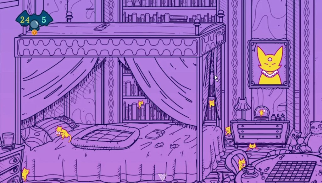 However, the real problem here is that in making the cats look like various monstrous creatures (sometimes with catlike features), it makes it far less clear what actually is a cat in this game. Sometimes a cat will look like a normal cat, sometimes it’ll look like a ghostly cat or a bat with cat ears… and sometimes, it will look like some other creature that has little in common with cats. Which would be fine, I guess, except the game also has creatures within it that aren’t cats. As a result, you’ll be clicking on things to see if the game considers them a cat or not, leading to some degree of trial and error.