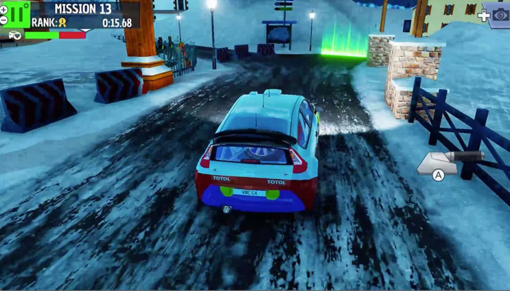 The game’s missions all take place in and around a rural town in a snowy, mountainous area. In a typical level of the game, you’ll be going through one of various routes through this area, guided in how you’re expecting to navigate by the presence of translucent green gates.