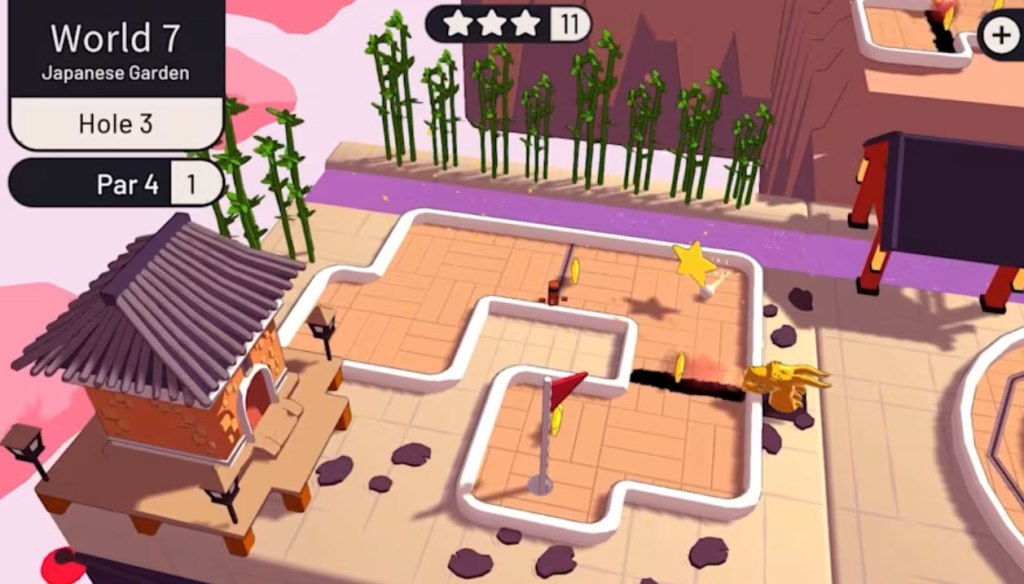In each of the game’s holes, you’re given a somewhat small enclosed Mini-Golf course with three stars on it, with players trying to reach the hole while obtaining as many of the stars as possible. You do this by choosing a point within a circle around the ball, with the direction determining the path it’s headed in, and distance from the ball determining shot strength.