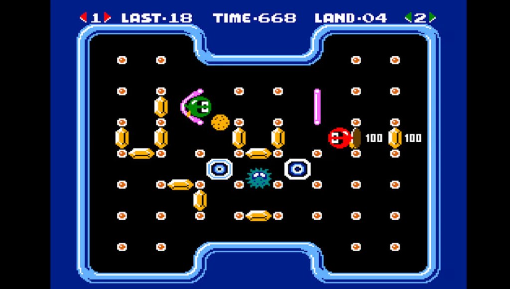 Clu Clu Land plays a bit like maze games such as Pac-Man, though instead of navigating a maze grabbing pickups while avoiding enemies, you’re searching the empty areas of each level for hidden ingots that end up forming the maze for enemies, while navigating by grabbing onto turnposts spread throughout the maze.