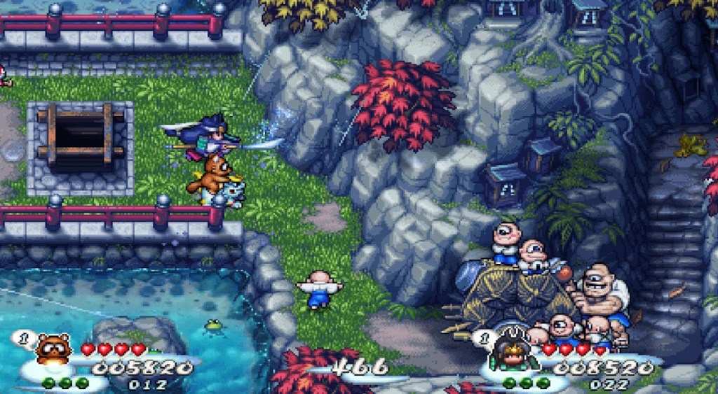 Speaking of danger, Pocky & Rocky Recharged is extremely tough, with lots of enemies on-screen that often don’t have any significant hit stun, frequent occurrences of enemies filling the screen with projectiles, and controls that don’t really allow you to aim and move independently (2-Stick Shooter controls would have been really nice here). What’s more, while this game does have an easy mode, you can only unlock it by playing through the regular mode first, collecting so many coins that you’ll likely just accept that you’ll be playing through the game in Normal mode instead. At the very least you can cut the challenge a bit by playing this game in Co-Op, but even there things will still be pretty tough.