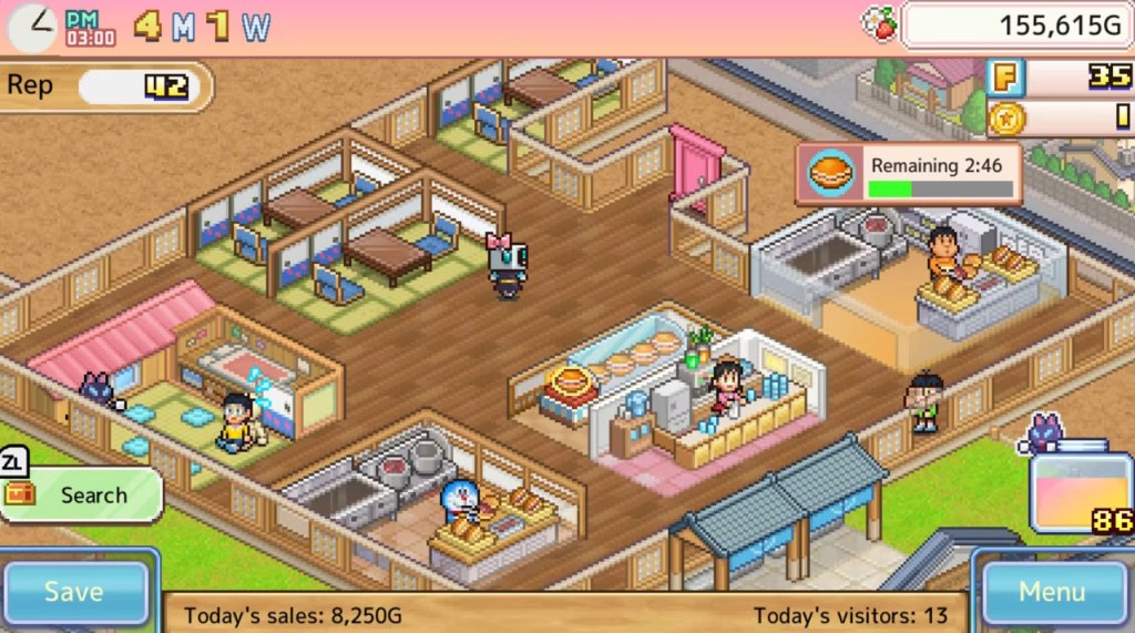 Okay, let me back up a sec and explain. I don’t think Doraemon Dorayaki Shop Story is a bad game, and in fact, I see a lot of the common issues from earlier Kairosoft games addressed here. While there are still gameplay elements that could do with better explanation, this game is generally decent about conveying information to the player. And players are given numerous ways to improve their products and in turn drive up their profits and popularity with customers. What’s more, this game adds a lot of variety and different ways to focus your energies, whether it is in exploring for ingredients, improving your staff’s stats, rearranging your restaurant for optimal performance, and so on.