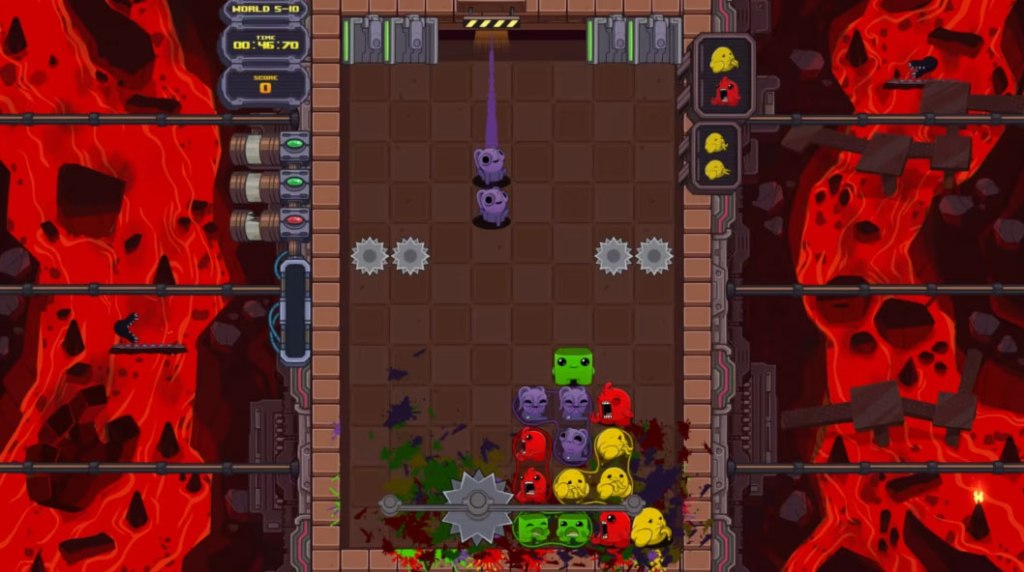 Rather, this game takes a standard Falling Block Puzzle game field or well, and turns it into an obstacle course, with each level featuring hazards to avoid. Touching one of these while trying to place a block (consisting of mutant Meat Boy clones) will cause you to lose and force a restart, which seems a bit arbitrary as your goal is also to destroy them, but only by matching them. Meanwhile, the game is indifferent about whether a hazard destroys a block after it is placed – it only cares if you touch the hazard before placing (bad), or destroy it by matching it (good).