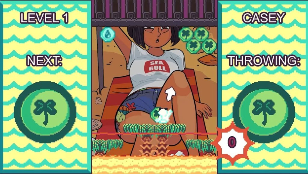 This is because the bubbles aren’t shot out from a stationary turret like in Puzzle Bobble, but flung by a seagull that walks around on the floor of the stage. In some ways this can make the game easier, as you can walk wherever you can reach to get an ideal shot. However, in other ways it makes things harder, as you now not only lose if the bubbles drop down to a line near the bottom, but also if your character falls down a pit or touches one of the placed bubbles.