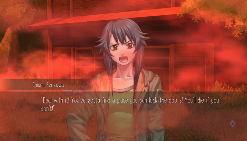 Another issue here is the game’s visuals, which are fine but not nearly varied enough. The game features some largely static 2D backgrounds with some really nice anime-style character art, but these characters have extremely minimal animation (mostly just eye blinks) and a limited range of expressions. Furthermore, the backgrounds don’t give you a great idea of the area’s layout, and the few times you’re actually shown what the werewolves look like, it’s a bit underwhelming. Oh, and while the game’s text describes some pretty gruesome scenes, the visuals rarely show anything more than a blood spatter, or a corpse’s arm poking out from under a blanket. It’s an odd choice – if the game was going to describe graphic violence in such a manner that it would necessitate an M-rating, you’d think they’d take the opportunity to show us the horrifying murders to drive home the intensity of the situation.