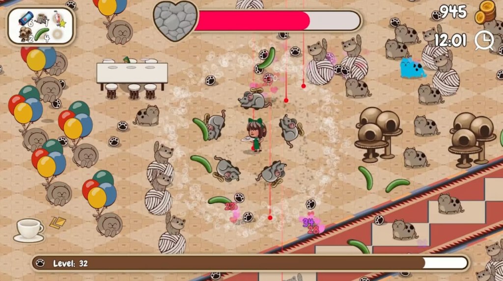 Sweet Survivors manages to avoid the first mistake of many Vampire Survivors clones – it is priced well under $5, priced at $3 instead. This means that even if it accomplishes nothing else, I can’t quite claim “for the same price, you can get a much better game”. Sweet Survivors also goes a completely different direction with its theming – you aren’t a hero fighting off monsters with an arsenal of weaponry gradually increasing in power, you are a coffee barista trying to serve customers while a horde of cats are attempting to dogpile on them, and you are placating said cats with toys empowered by “love”. Extremely saccharine, to be sure, but this game isn’t called “Sweet Survivors” for nothing (though I do note a lack of sugary treats one would expect with such a title).
