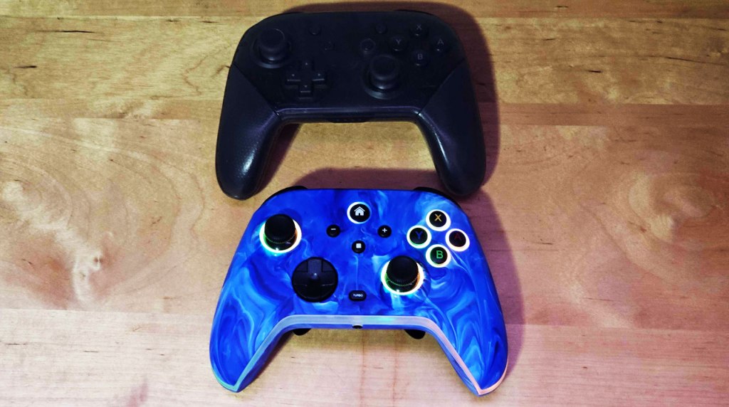 The ZrzlMVP Wireless Switch Controller does indeed share much in common with Nintendo’s own Nintendo Switch Pro Controller, with a comparable button layout, analog stick placement, size and overall shape. However, ZrzlMVP’s controller weighs less, has concave analog sticks (not hall effect sticks, so drift may eventually become an issue), and features a connected disc-shaped D-Pad.