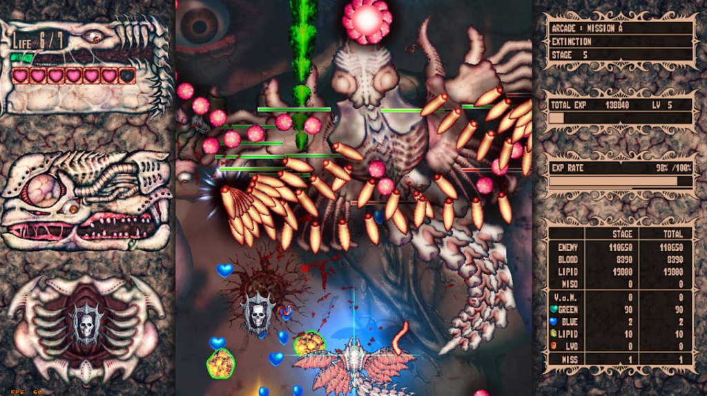 The first and most noticeable is the presentation, which uses detailed 2D visuals to combine themes of angels and gruesome, bloody body parts. Not everyone will appreciate this theming, though it does at least get away from the overplayed spaceship/WWII plane motif many games in this genre have. Oddly, despite that this game’s visuals look like they were ripped off the cover to a heavy metal album, the game’s soundtrack is strangely placid, with serene synthesized themes that don’t fit this game’s visuals nor its gameplay.